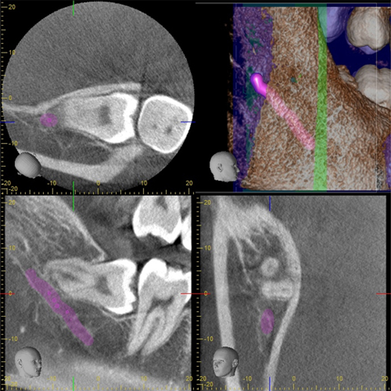顎の神経と埋もれている親知らずの根の先の近接を認めるため、